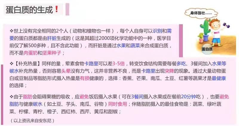 《纽约时报》保健类畅销书排行榜冠军《医疗灵媒》作者安东尼·威廉(安东尼自然疗法创始人)告诉我们,事实上,我们的身体是由肝脏负责生成我们身体可以识别的蛋白质类型。肝脏实际上是通过水果、绿叶蔬菜和蔬菜来生成蛋白质,而不是大多数人认为的蛋白质粉、培根、酸奶、牛肉、鸡肉、豆腐、鱼、牛奶、坚果和种子等食物。这是肝脏这个体内的化学大师超过2000多项化学功能中的一种。