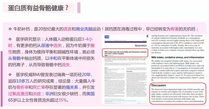 还有,动物蛋白摄取越多,钙流失越严重!研究发现牛奶等动物蛋白摄取越多,骨质疏松越严重,骨折比率越高!