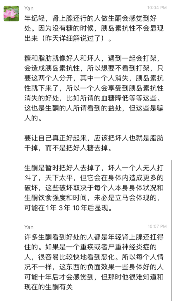 还有一个最容易误导生酮饮食者,以为身体变得更好的原因是,肾上腺素本身就有【让人感到精神清明爽利】和【镇痛】的作用。生酮期间耗用大量肾上腺素,导致人觉得精神状态极佳,而且原来的病痛感减轻或者消失了,于是就误以为身体变得更好了,毒素被燃烧掉了!