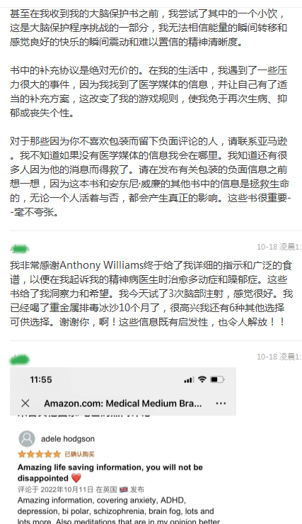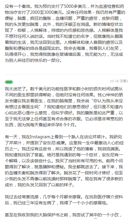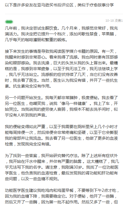 文章的最后,贴一份来自美国亚马逊网站,安东尼的新书购买链接下面的购书者评论区的一则评论。这则评论其实是购书者自己的疗愈故事——讲述了他几年前实行生酮饮食、禁食、苹果醋、咖啡灌肠等各种风潮(这些风潮安东尼都解释过其害处)而导致身体出了大问题,最后全靠安东尼疗法获得恢复疗愈的亲身体验经历。我们群友用翻译 app 给译成的中文,有兴趣的话凑合着看看吧: