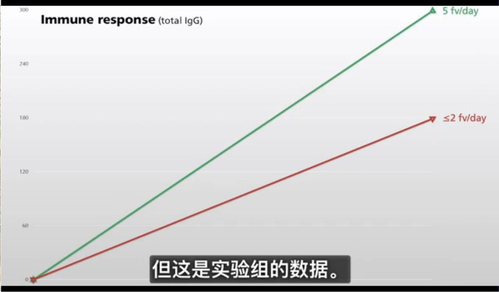 其他类似研究还有不少。比如贝尔法斯特的研究人员报告了一个研究结果(中英视频请点这里),认为老年人的免疫力下降可能与不良饮食相关。为证明此结论,临床研究找了83名志愿者,年龄在65-95岁之间,分成两组,对照组每天只吃可怜的2份或更少的水果、蔬菜;实验组则要求每天至少吃5份蔬果。一个月后给这两组接种肺炎疫苗。实验组并没有实现每天吃足5份蔬果的目标,但至少比对照组吃得多。