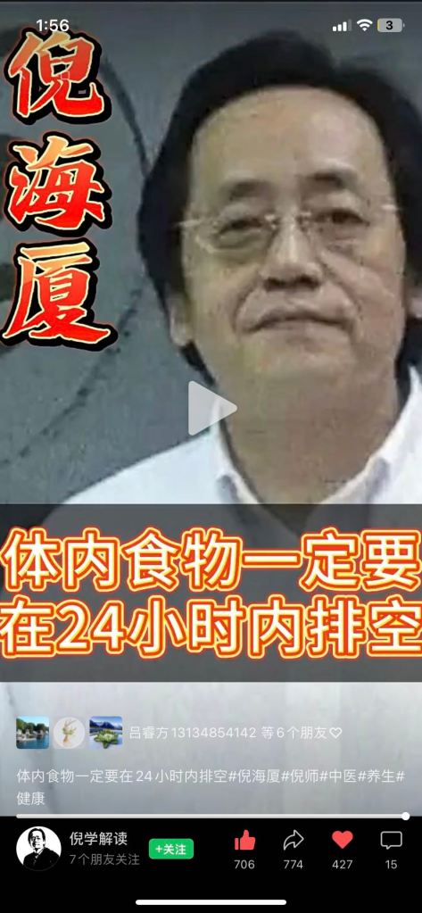 倪师倪海厦(下图),当代中医殿堂级名医,很多中医师的老师。在他的一段教学视频中说道:“你今天吃下去的食物,只要到了嘴巴里面去,在身上待24小时(之内),一定要排出去。健康的人是以虚,身体以虚为健康,而不是以实为健康。所谓虚的定义不是人很累很瘦弱,不是;而是说所有的新陈代谢,所有的新的东西进去,都能够把旧的东西代谢出去;不会累积很多食在身体里面。”