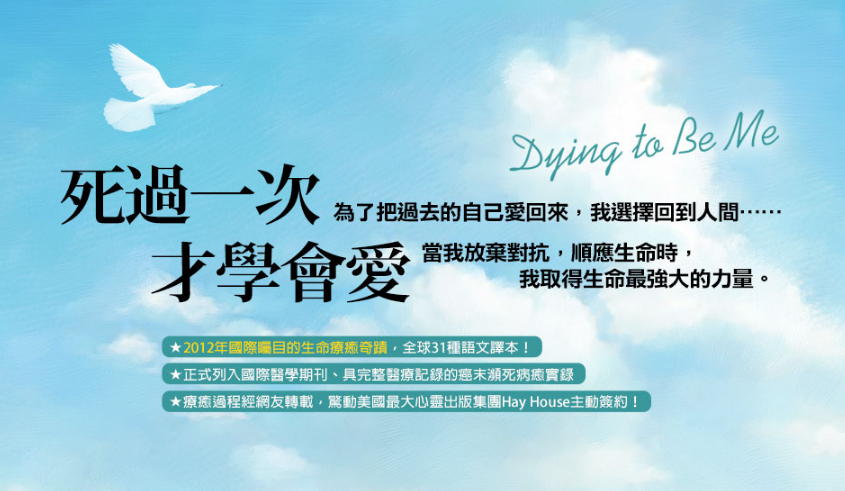 现在,我们来尝试把这篇问答带入一个更深的层次。分享一个很经典的例子,就是全球达31个译本的著名畅销书《死过一次,才学会爱》(这是港台译名,大陆译名更好听《再活一次,和人生温柔相拥》,英文原名:“Dying To Be Me”)。