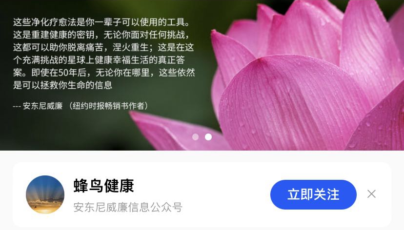 “安东尼威廉彻底改变了我和我家人的身心健康,这个公众号是为了感谢安东尼威廉,希望有更多在寻找健康答案的人可以获得关于康复的中文信息。这是火炬的传递,每个人都点燃自己和周围人的健康之火,将光明传递下去。蜂鸟是光之鸟,虽然很微小,但是如果每个人都尽力,我们可以一起让这个世界变得更健康更光明。愿所有人健康、平安、幸福。”