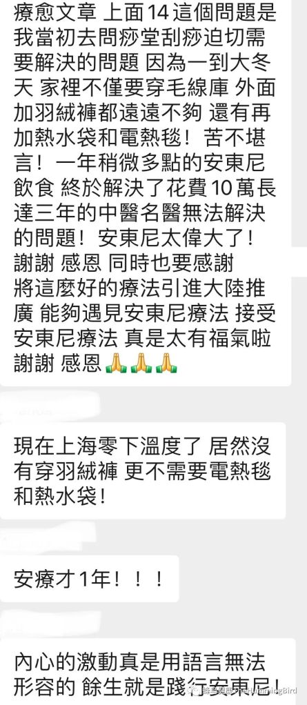 再比如下面这位群友:“一年多的安东尼饮食方式,终于解决了花费10万,长达三年的中医名医无法解决的问题!安东尼太伟大了!”