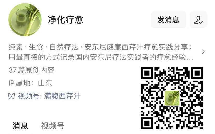 这个公众号不但分享安东尼疗法信息,还是一个崇尚和推广自然生活,分享食素食生食气的平台!正如创办者清泉希望传达的:“尊重生命,生命才会备受祝福!提升意识、回归灵性,新人类心饮食生活,康复觉醒喜悦创造!”