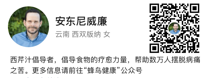 个人特别特别希望您读一次下面链接这篇《关于蜂鸟健康》。“蜂鸟健康”创办者 Yan 的一番肺腑之言,讲述了她是如何在一次偶然的机会看到了安东尼·威廉的书,如何在阅读并践行之后,身体出现了惊人的变化!而在推荐给家人朋友践行之后,同样出现了惊人的逆转效果!非常的振奋人心!这里我摘录一下文章的最后一段,表达了她创办“蜂鸟健康”的一份初心: