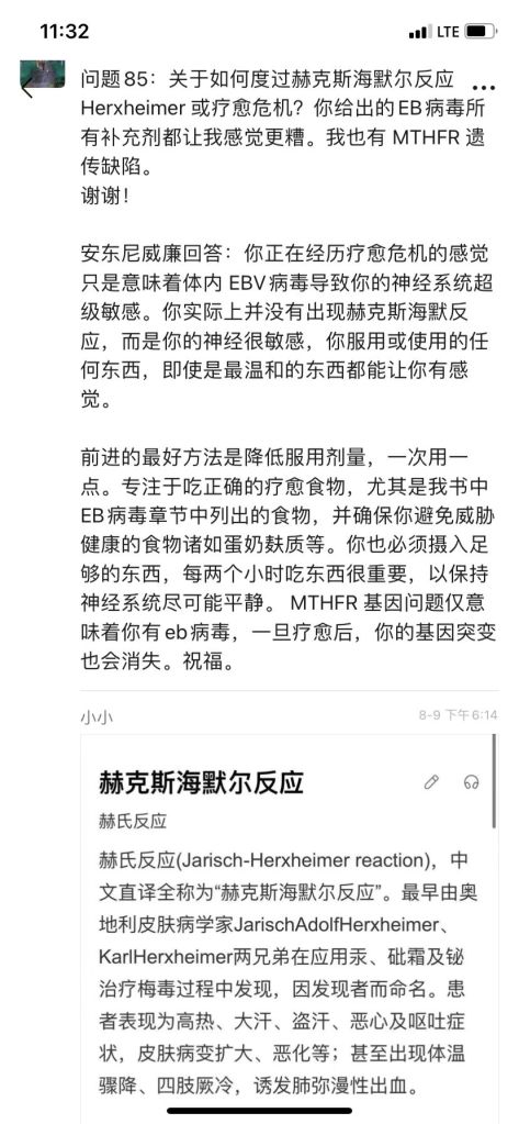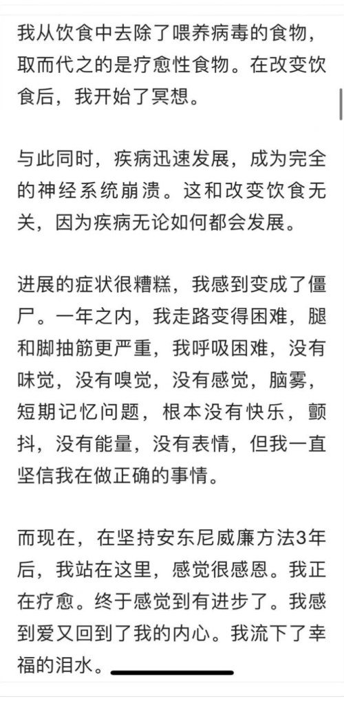 再来一个例子,2022年1月13日,还是《科学》(Science)发表的一份重磅研究成果——【EB病毒(Epstein-Barr)竟是号称”不死癌症“的多发性硬化症的元凶!】(详细点击这里)。然而事实上,安东尼早在2015年底发行的第一部著作《医疗灵媒:慢性与难解疾病背后的秘密,以及健康的终极之道》(初版)中,就已经明确指出——多发性硬化症就是EB病毒造成的!并给予了我们逆转的方法。(下图:一位安友的实践分享视频截屏)
