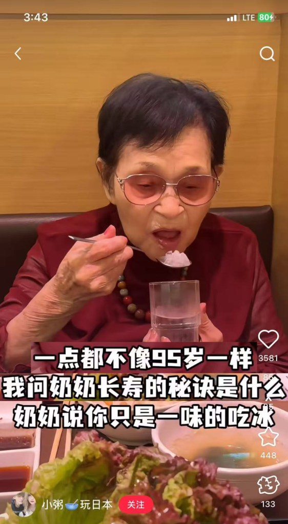下面视频截屏来自一位在日本的博主;他和日本女友探望她的已经95岁高龄,仍能保持身体健康的奶奶。奶奶看上去很年轻,一点不像95岁的样子;博主问奶奶长寿的秘诀是什么,奶奶说秘诀就是吃冰喝冰水(如图)。虽说不见得吃冰喝冰水真的能让人长寿,但看上去至少并没有给这位老奶奶造成健康上的什么负面影响吧?