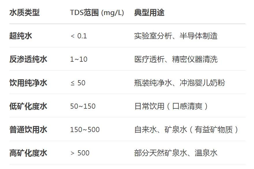 注1:世界卫生组织(WHO)推荐饮用水的 TDS(Total Dissolved Solids,溶解性总固体)是 ≤300 mg/L。