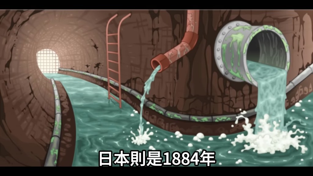 而在西方,在十九世纪末,随着细菌学的发展,他们认为与其推广热水,不如从源头保障水质的安全;因此大量兴建自来水系统与污水处理设施,以取得干净的不受污染的水。比如英国伦敦的污水下水道,于1859年已然动工(日本则是1884年);从此以后,伦敦再也没有发生过霍乱大流行。