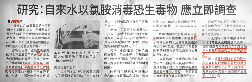 而且,自来水厂会在水中加进氯以消毒灭菌;然而,实际上氯是对健康有害的。以下是一则剪报新闻: