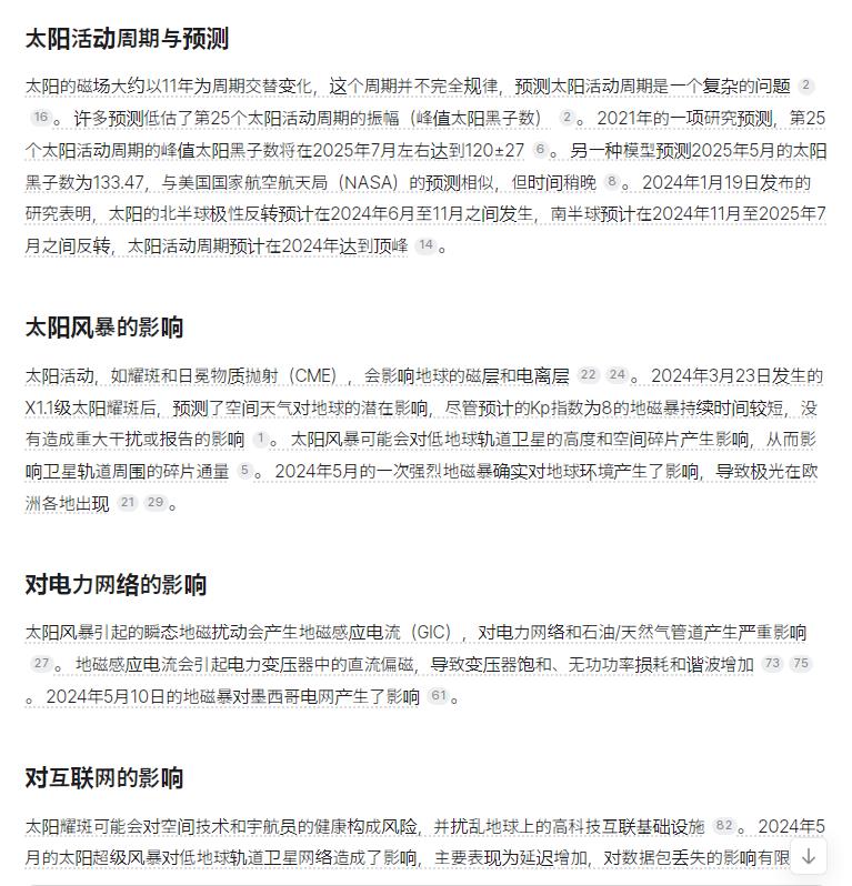 然后我就问了另外七个海外的AI(因为AI有时会答错的)。比较一致的,都是同意理论上2025年7月时,太阳活动达到11年周期的最高值。不同处在于,有五个AI说,科学家预计这个周期相对平静,尽管仍需密切关注。也就是说,专家预计不会出现导致大停电那么巨大的电磁风暴。当中还有两个AI认为,虽然2025年太阳活动仍将保持“火热”水平,但与2024年相比,预计爆发活动的数量和强度都会有所下降。以下是最为详细的一个AI回复(字小,可以把手机横过来看):