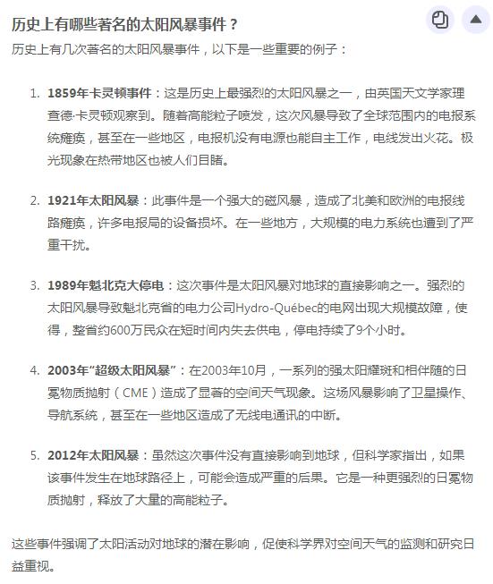 此外,还有的AI列出了过往太阳风暴影响地球电力设施或其他设施的事件。下面是列举得比较详细的一个: