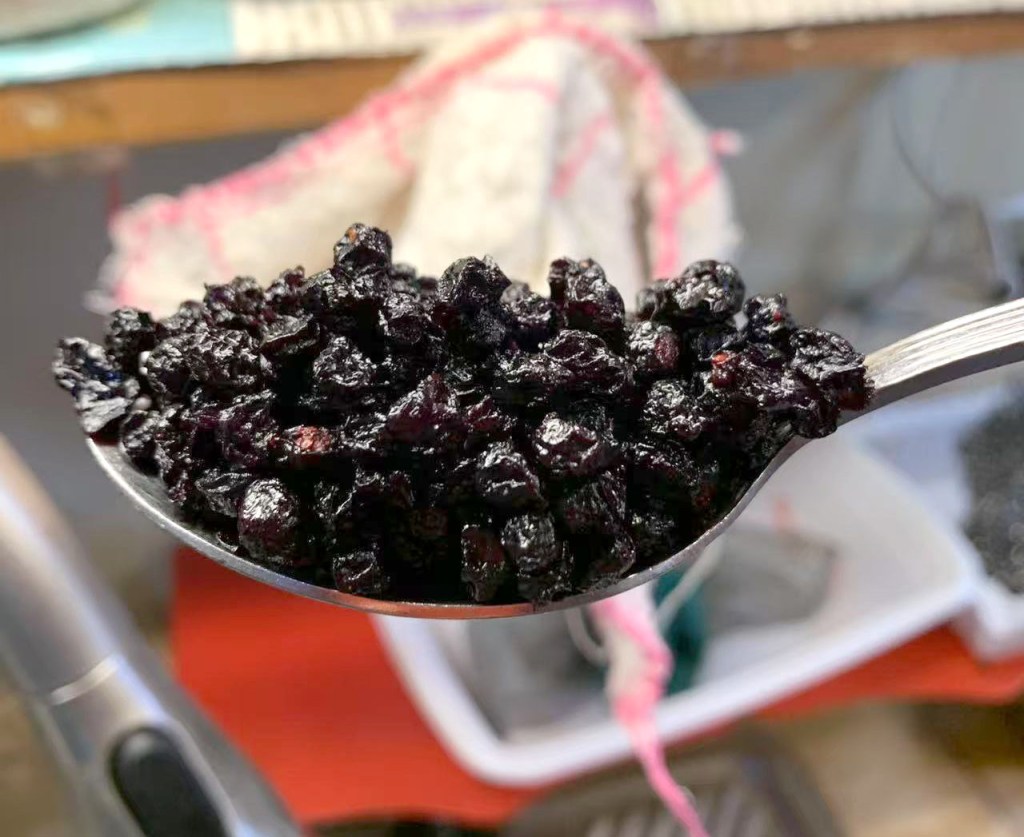 因为我买到的野生蓝莓干里加了糖和葵花油,所以得用热水冲洗一下再用。(不过纵使这样,也不大可能百分百清干净的,所以买这种野生蓝莓干只是一个退而求其次的选择。)