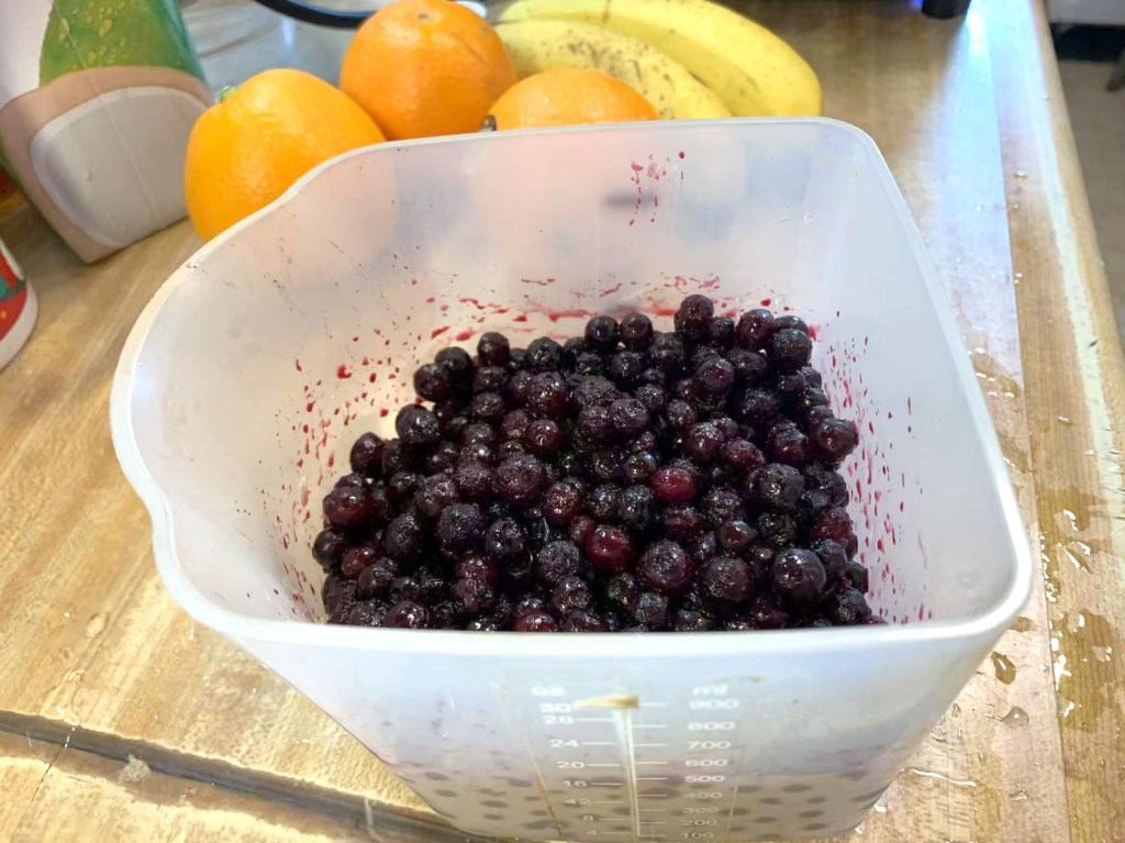 如果出于经济的考虑或别的原因没买冰冻野生蓝莓,也可以用野生蓝莓粉,或野生蓝莓精华液,或野生蓝莓干。如果用野生蓝莓干的话,我会大致用三汤匙。
