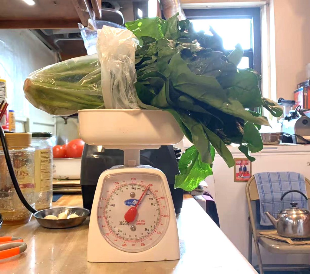 然后,我又发现一忙起来,经常晚餐的菠菜汤就顾不上做了,导致吃不上,所以后来就干脆把两餐菠菜汤都一次性做好了。又因为安东尼说对于慢性病,每天摄取一斤绿叶菜会很有帮助!所以,我这两餐的菠菜加起来会有一斤(1 1/8磅)。